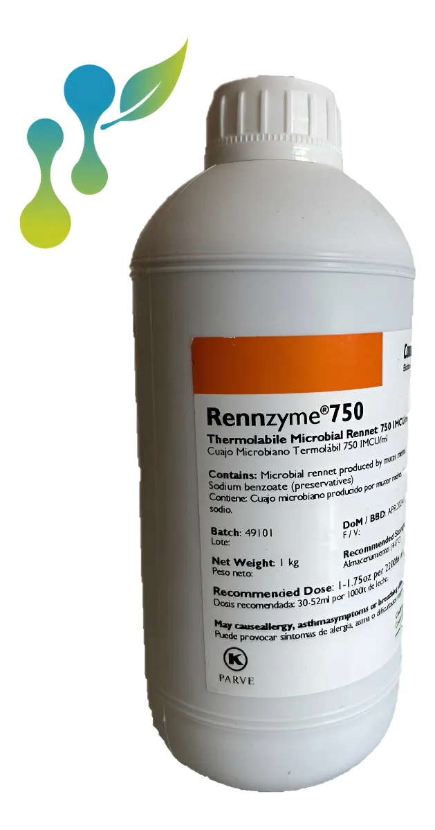 Rennzyme 750 es un cuajo microbiano sensible al calor, obtenido por fermentación controlada de Rhizomucor miehei. Es una alternativa económica a la quimosina vegetal, garantizando un cuajado preciso y desactivación casi completa tras el tratamiento térmico, perdiendo más del 97% de su actividad a 150 °F (65.6 °C) luego de 15 minutos. Reduce el riesgo de sabor amargo y es ideal para quesos de pasta hilada, duros lipo itallanos y cremas untables manteniendo calidad. Actividad: mayor o igual a 750 IMCU / ml Beneficios: Costos de producción más bajo en comparación a quimosina vegetal, sensibilidad al calor minimizando la actividad residual que afecta el sabor. Aplicación: Rennzyme* 750 es utilizado en la coagulación de la leche para la fabricación de todo tipo de quesos especialmente quesos tipo pasta hilada y queso duros tipos Italianos y quesos crema untables. Niveles de uso: Los niveles de uso de enzimas generalmente están determinados por las condiciones de procesamiento, el pH, la composición de la leche y la concentración de cloruro de calcio, cuya utilización se recomienda con el cuajo Rennzyme 750. Dósis recomendada: 50-80 mL / 1000L, con pruebas laboratorio o escala piloto recomendadas para optimizar la dosis. Temperatura óptima de uso: La temperatura óptima es alrededor 25-40 °C. pH: En el rango de ph de procesamiento típico de 5.5 – 7, la actividad aumenta a medida que disminuye el pi. Presentación: 1kg. Cuenta con certificado Kosher Sin garantía