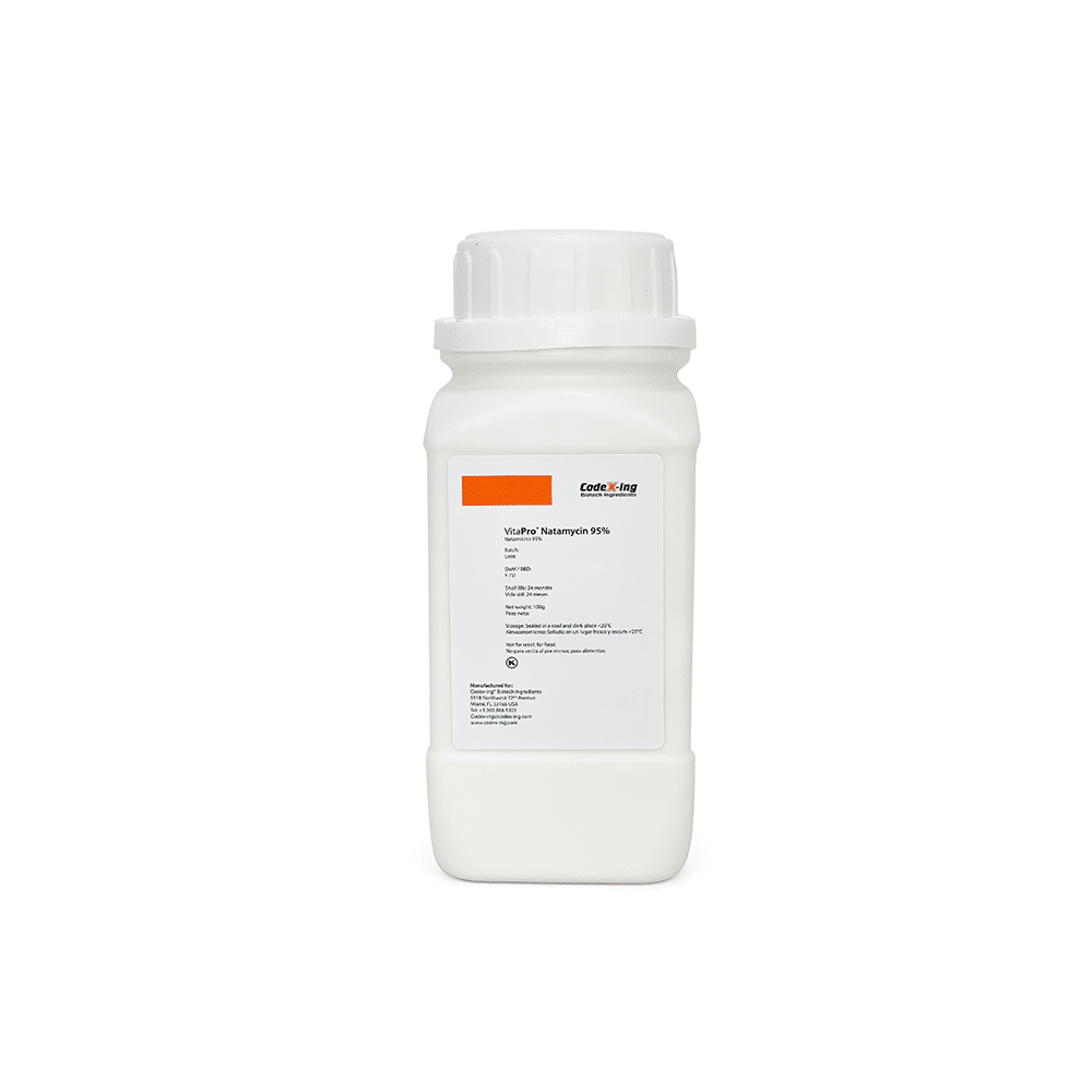 VitaPro® Natamicina 95 es un conservnate natural rentable que se utiliza para prevenir el deterioro de los alimentos causado por el moho y las levaduras en la industria de procesamiento de lácteos. Se produce por fermentación de Streptomyces natalensis y se ha demostrado que es muy eficaz en pequeñas dosis. (También en comparación con conservantes sintéticos o químicos). No tiene actividad contra el crecimiento de bacterias.